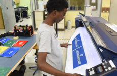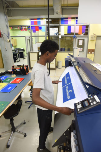 un traceur d’impression numérique Epson Sure-Color SC8060 de Laize 162cm, un plotter de découpe Summa D160RL de Laize 160 cm, deux plotters de découpe Graphtec CE7000-60 de Laize 60 cm, deux postes Mac avec Adobe Illustrator + Cutting Master, un poste pour piloter le traceur Epson et le ploter Summa via le logiciel Caldera, un Laminateur Kala Mistral 1650, un vidéoprojecteur, un massicot électrique, une table de découpe Bench + 1 règle de coupe SmartFold de 3,60 m, une découpe verticale et une presse numérique Heidelberg.